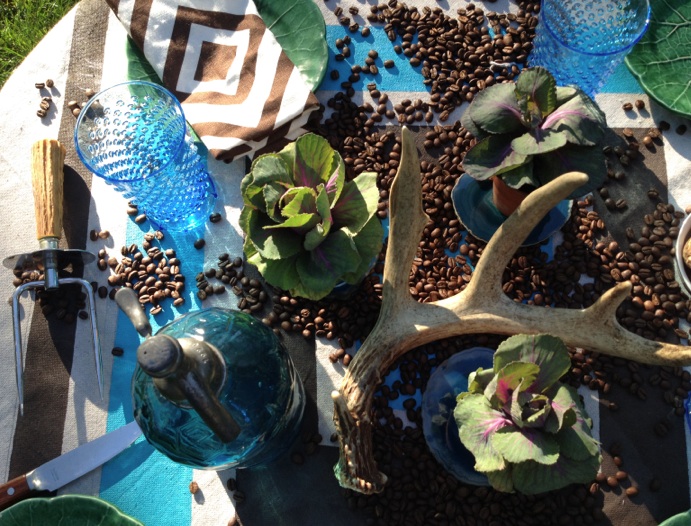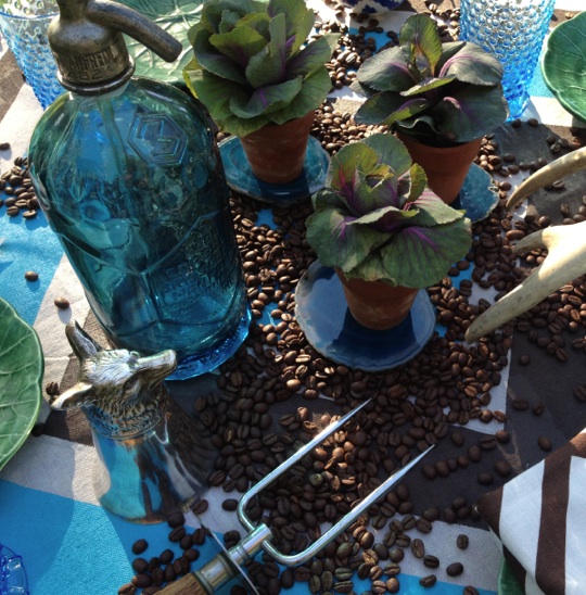 (2) Look in your cupboards. It is one of the best places to look for inexpensive decor. Coffee beans, in this instance, add a wonderful texture and provide amazing aromatherapy. Leafy greens, such as kale, can serve as an unexpected alternative to flowers. Citrus, herbs, nuts and vegetables (currently loving eggplants for long farmhouse tables) are also great options.