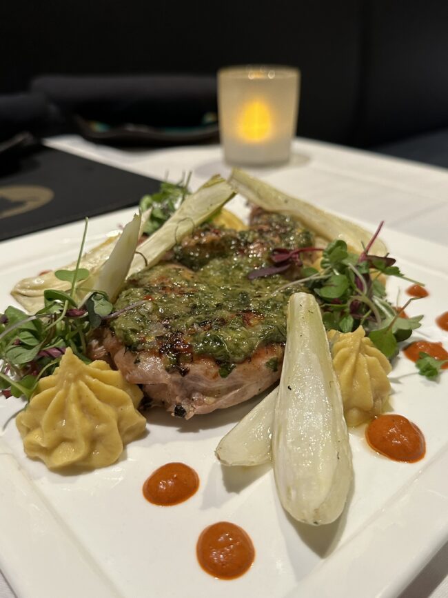 The restaurant boasts a cellar of over 1,100 bottles of vintage wine. When waiting for your table, you can view their extensive collection in the restaurant’s lobby. Nine wines by the glass are offered, alongside three cocktails, including A Fashionable Scotch, which feels just right to sip on while nestled in one of their corner booths.