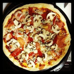 Prosciutto, Mushroom, Roasted pepper and Blue Cheese Pizza in the works By Allison Arthur | December 20, 2012 ← Apres at Home