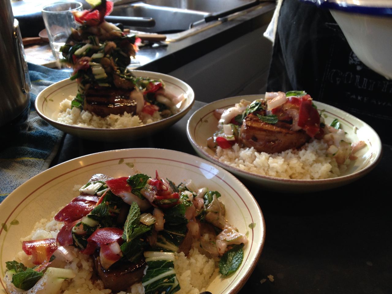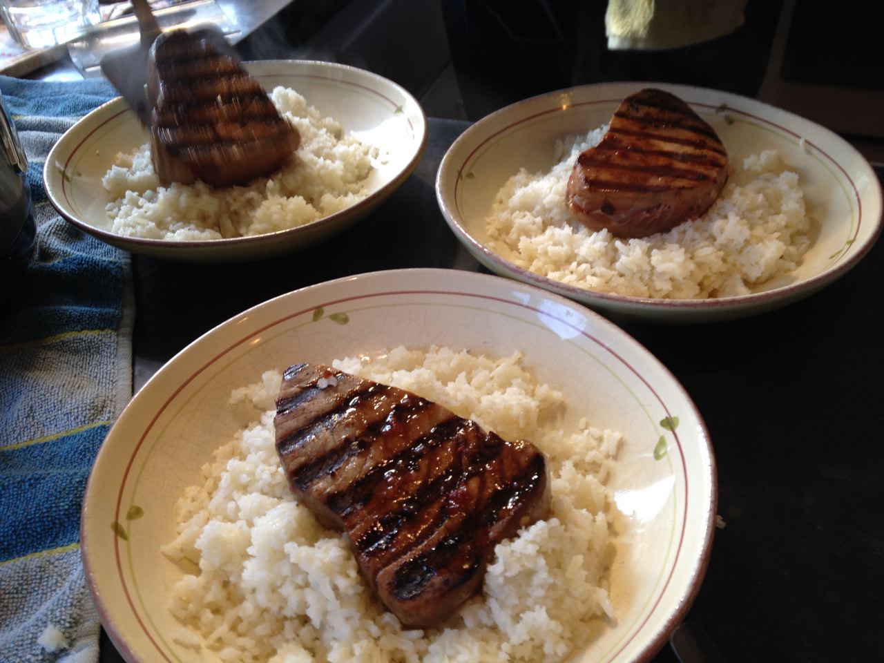 - To plate, place about a cup of rice in the bottom of a shallow bowl. Put the grilled tuna on top and spoon a generous amount of the slaw and sauce that comes with it on top of the tuna and rice.
