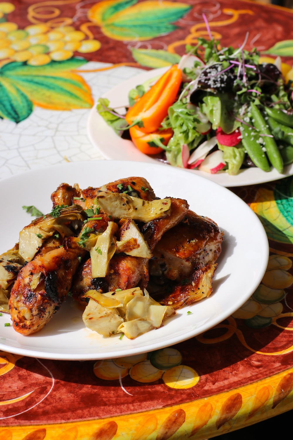 Calico’s organic bar chicken is perfectly roasted with a lemony vinegrette and artichokes.