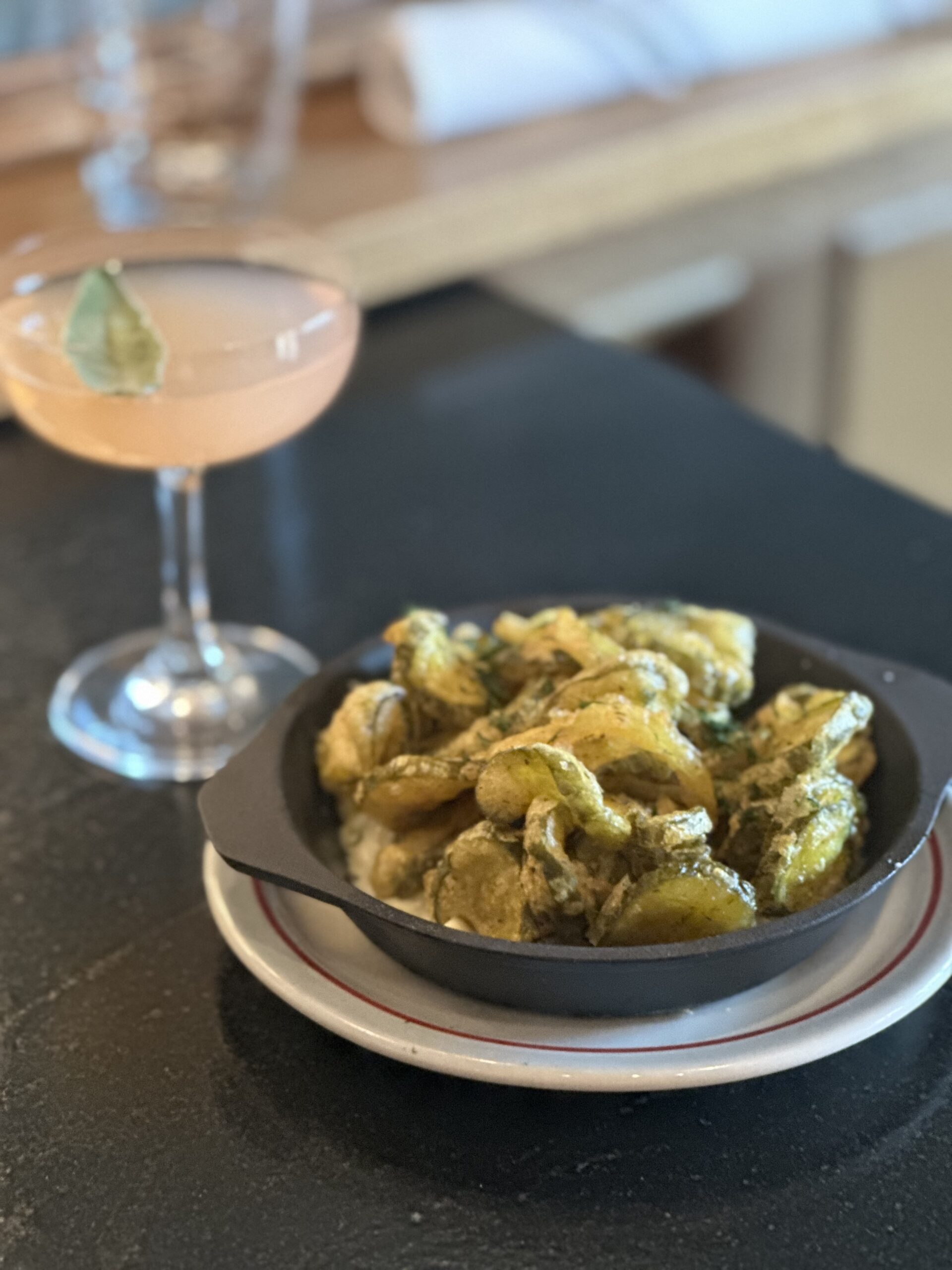 Diners can enjoy indoor bar or dining room seating or dine al fresco on their lovely patio tucked away alongside Pearl Street. The bar area gives a speakeasy feel, with dark leather chairs, wooden walls and ceiling, and unique fixtures. The menu is approachable, offering modern spins on pub classics, including entrees such as a polish sausage with spatzle entrée, a cider braised pork chop, and Dover sole served with a crabcake. The starters are perfect of course to start off your Coe Tavern experience, but also to share over cocktails with a few friends. The lamb tartare topped with an egg, served alongside house made chips is delicious, and a little something different from the norm. Another honorable mention, the frickles, served with a lemon aioli are tempura fried, offering a lighter version of a classic pub fried picked favorite.