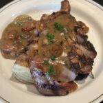- Coe Tavern’s cider braised porkchop with Swiss chard, tomato raisins, fennel, and cider jus.