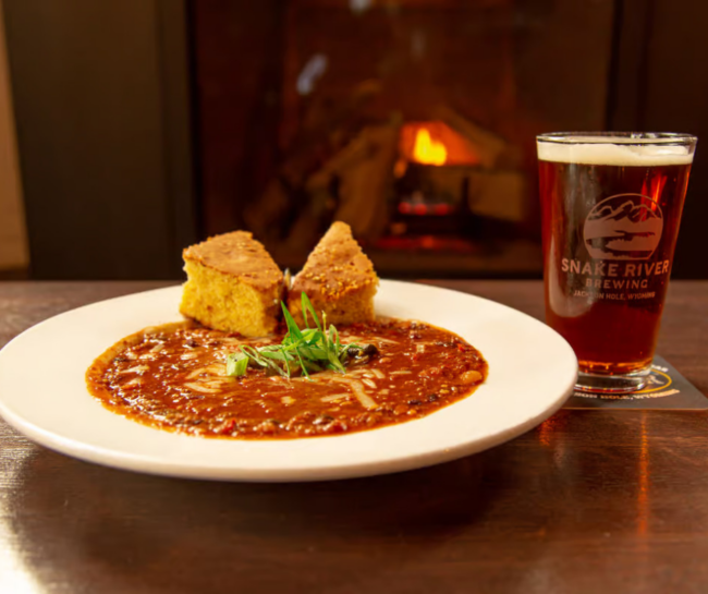 Snake River Brewing’s award-winning chili is the ultimate bowl of warmth for a crisp fall day. Packed with Wyoming bison, Mead Ranch beef, beans, tomatoes, and spicy chilis, it’s a hearty blend of flavors. Topped with sharp white cheddar, green onions and pickled jalapeños, and served with a side of cornbread, this chili has won Jackson Hole’s Chili Cook-Off three times—proof of its unbeatable flavor.