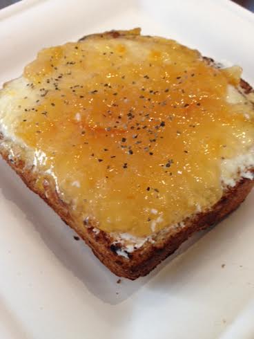 The toast was then topped with a thick (but not too thick) spread of goat cheese. The jam came last and I asked for a sprinkle of pepper on top.
