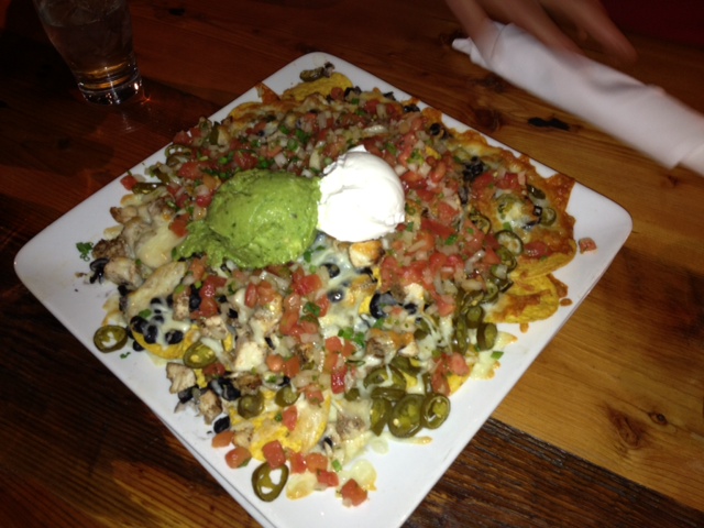 Of course the Devils on Horseback — dates with goat cheese wrapped in crispy bacon — made sampling the healthier options more interesting to my husband! When our friends arrived we shared the Marley Nachos – a mound of tortilla chips topped with a generous amount of jerked chicken, jack cheese, black beans, jalapenos, green onions, and sides of guacamole, sour cream and pico de gallo. While salty chips smothered in cheese is hardly health food, you can go easy on the sour cream and choose chips with less cheese and more veggies, beans and chicken to get some valuable nutrients.