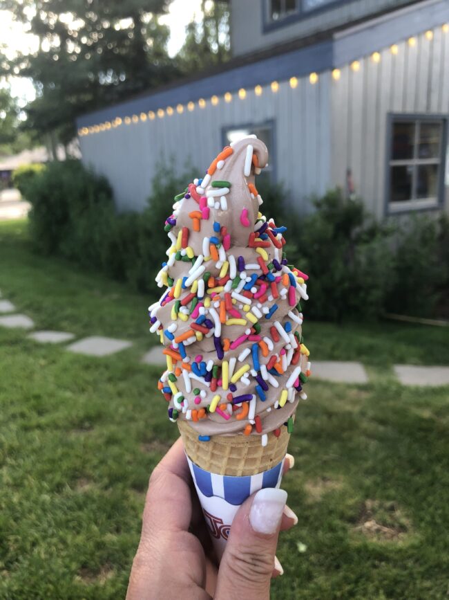 Chocolate frozen custard in a sugar cone with rainbow sprinkles