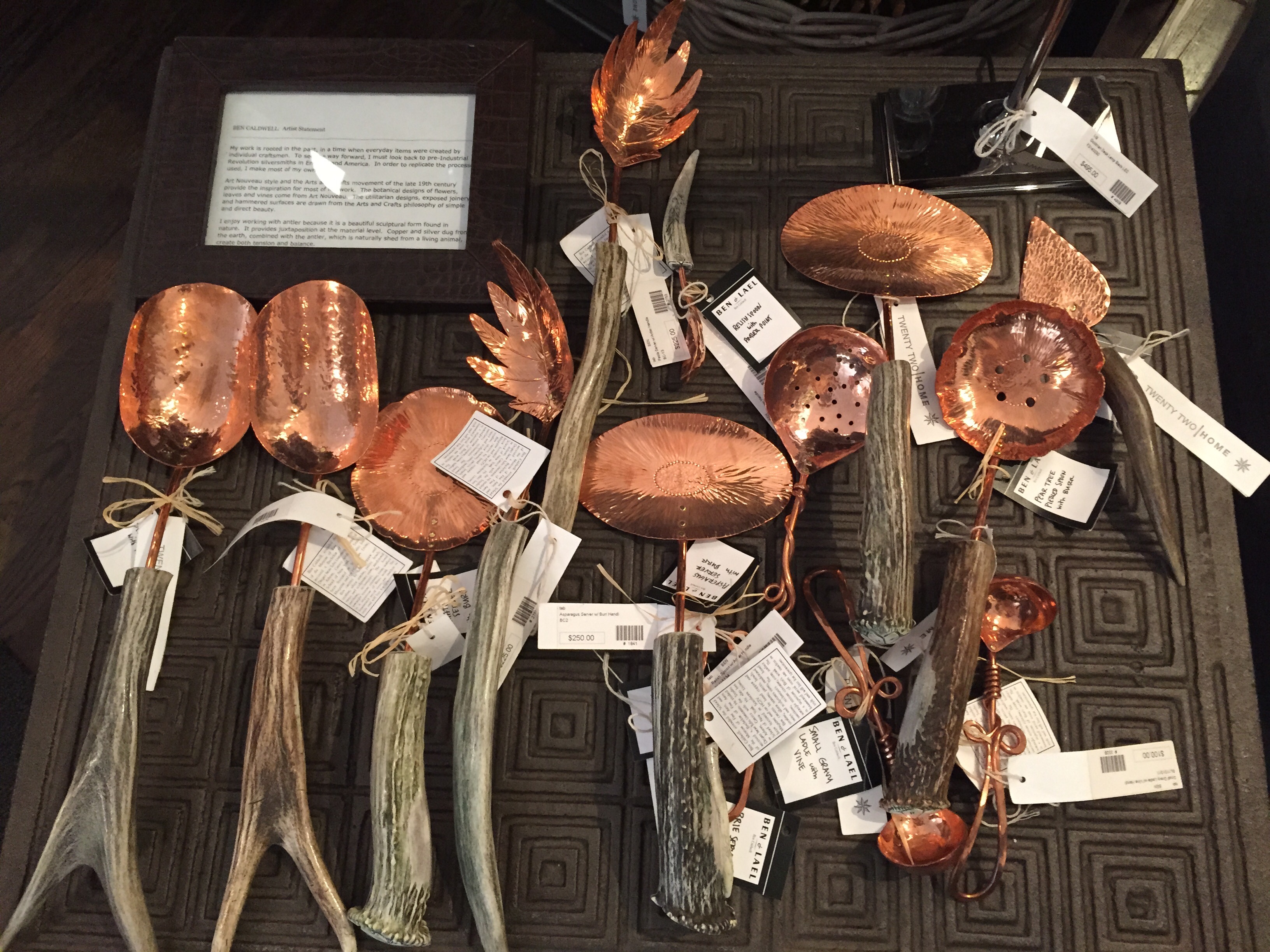Wood and antlers are very popular in rustic decor. Many artists and designers are now mixing copper, silver and gold with wood and antler to produce gorgeous artistic flatware and serving utensils. Some of our favorite designs are handmade by Simon Pierce, a Vermont based company.