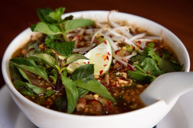 The Noodle Kitchen has a menu filled with amazing soups, but their Dan-Dan noodles are a must-try. Packed to the brim with bok choy, shiitake mushrooms, onions, broccoli, peanuts, mint, basil, cilantro, bean sprouts and ramen noodles, this vegan sweet and spicy soup will not leave you hungry.