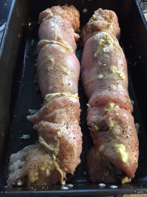 I watched an Ina Garden video about how to roll a roulade, which I wasn’t that worried about trying anyway. The main thing I learned was not to over stuff the stuffing layer. I needed a second set of hands to help me tie the roll together with twine and once that was done, rolled the meat seam-side down in a roasting pan.