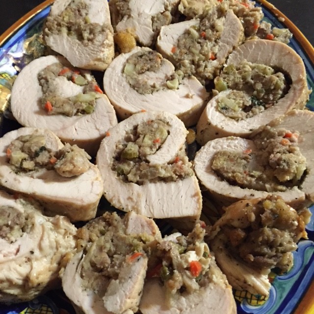 I made a stuffing I loved at Thanksgiving and decided to prepare a turkey roulade with the same stuffing. I ordered two fairly expensive turkey breasts from Pearl Street Market and had them prepare the meat perfectly for me. It was well-worth the $90, as it turned into the most moist turkey I have ever made or even had.