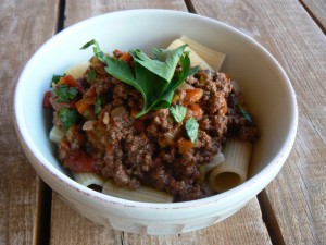 Not only did I leave my private instruction a better hunter, I left there hungry. A two or four hour target practice and thoughts of wild game is serious cause for hunger. I usually plan ahead for things like this. Whether you have tenderloins marinating or beans on the stove, it’s nice to come home to a hot meal after a long day of hunting or practicing. This time, I had a rustic bolognese simmering in a dutch oven waiting for me. It’s one of my favorite recipes of mine because there are no rules. Sometimes I use wine, sometimes I use beer. I substitute the vegetables for anything I may have in my fridge. Also, it works well with any wild game. I’m still using buffalo until I get my (fingers crossed) deer.